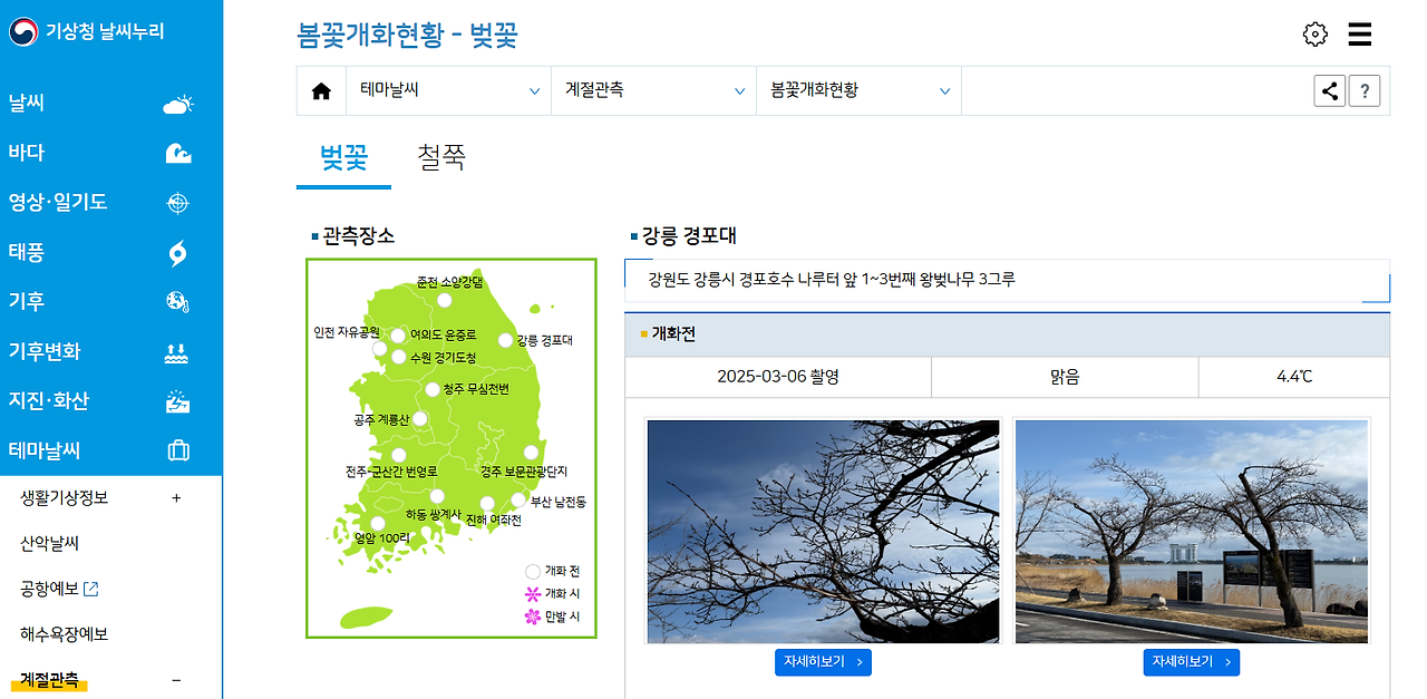 | 기상청과 민간 기상사의 예상 발표 기준 제공 | 하동, 김천 등 실시간 영상 제공 | 제주부터 시작, 서울과 강원은 4월 초중순 |
